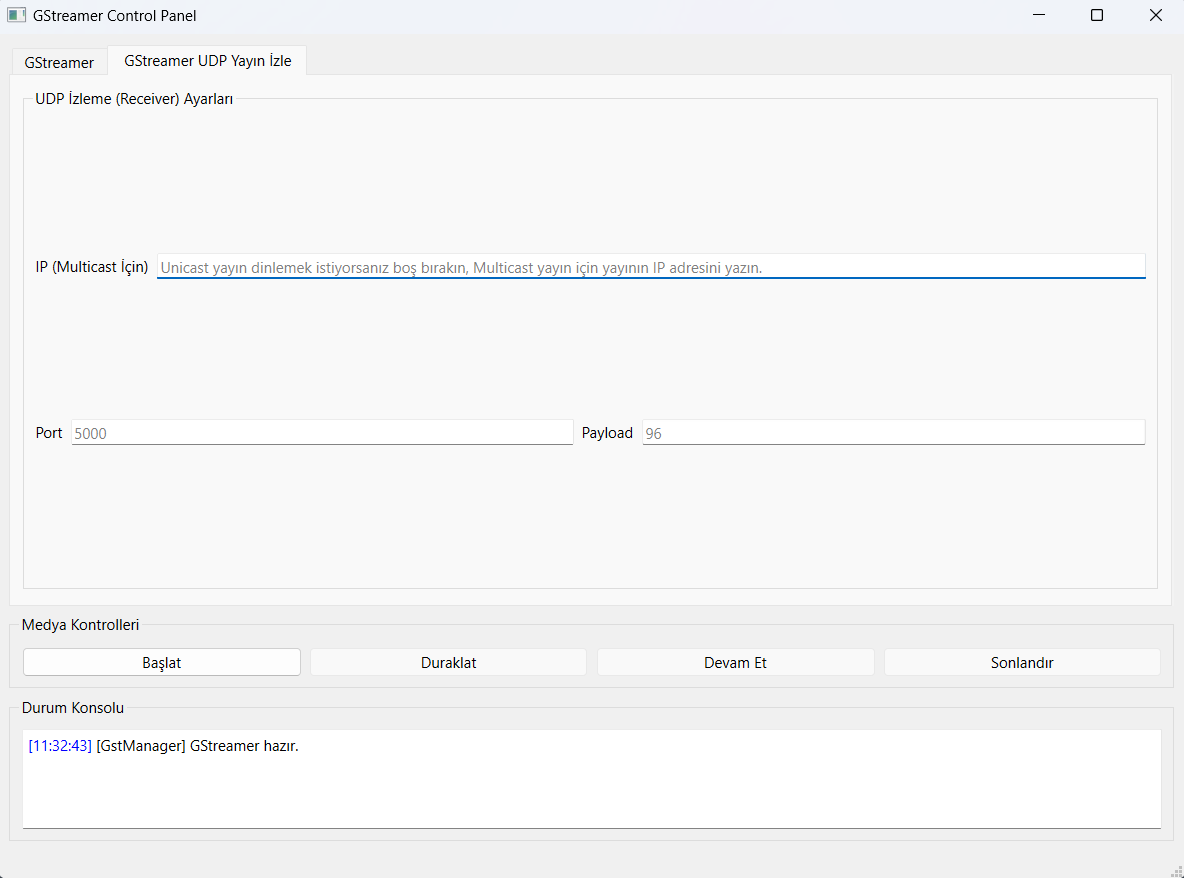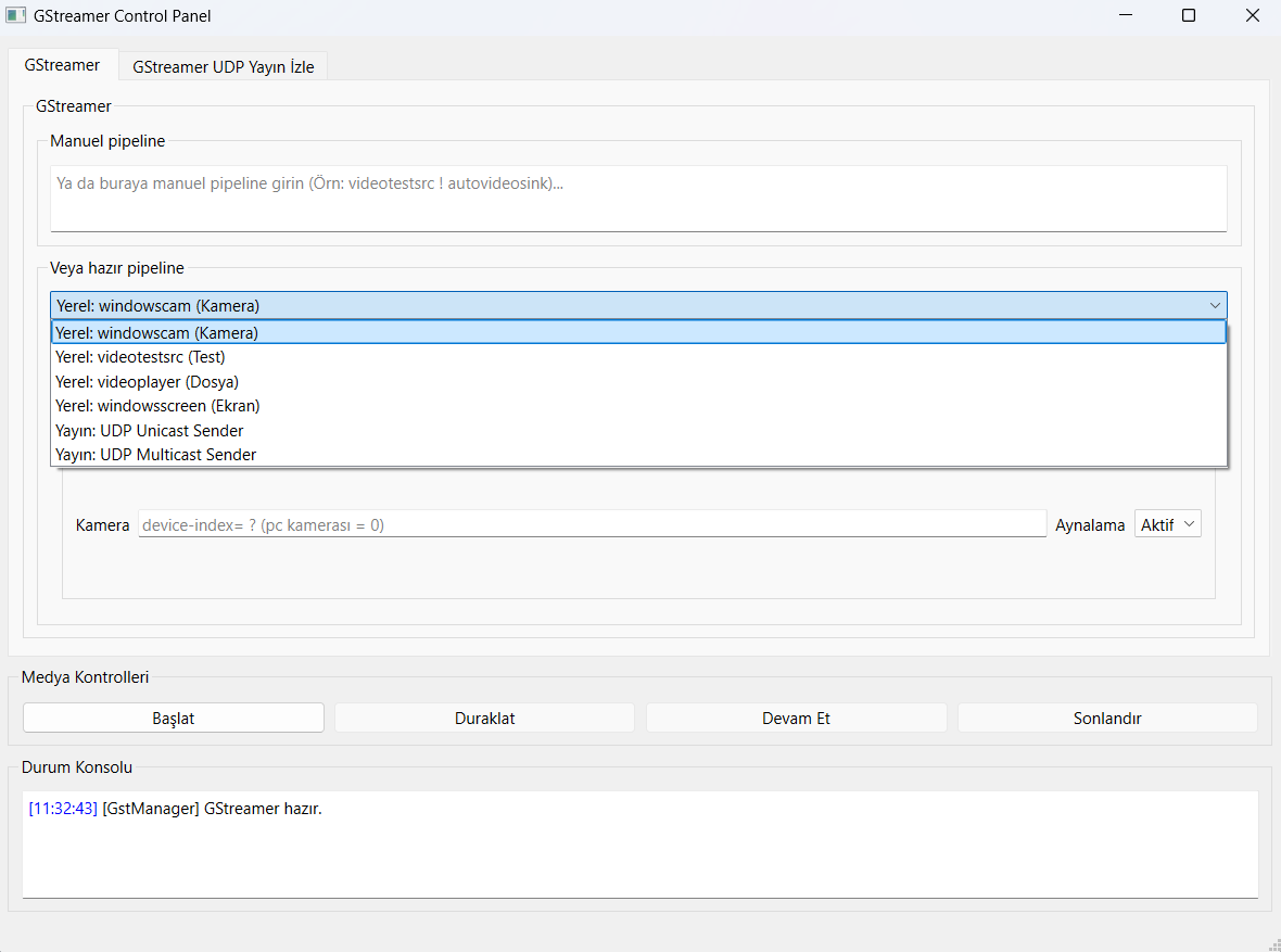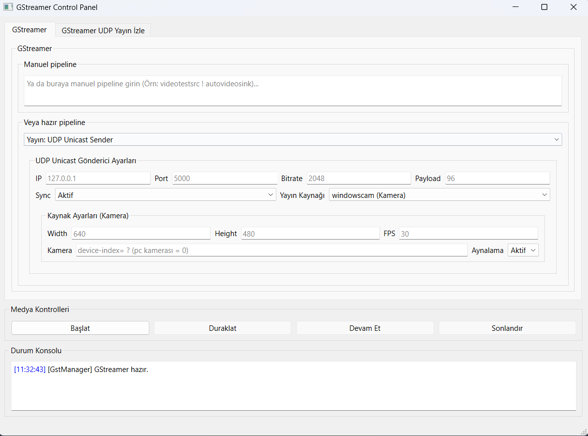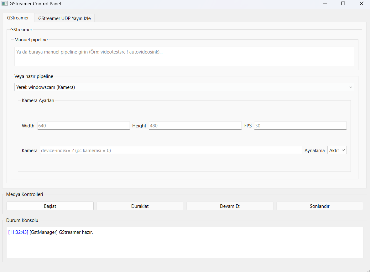 GStreamer pipeline'larını test etmek, kamera ve ekran kaynağı almak, UDP yayın oluşturmak ve yayın izlemek için geliştirilmiş profesyonel kontrol paneli.